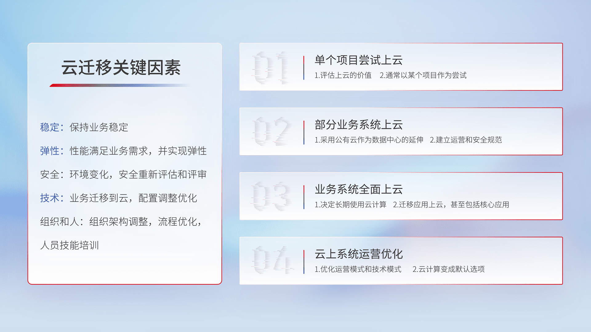 结合实际业务,,,从规划设计、、、云平台选型、、、、云原生改造、、、、数据迁移、、集成交付,,,,迁移全过程为客户识别最佳上云路径,,做好风险识别管理,,,,设计网络架构、、、、身份权限、、安全审计合规、、操作审计、、日志审计、、、、监控告警策略、、多站点容灾设计等,,,,对云上基础设施进行整体规划,,提升IT治理水平,,以满足弹性、、、高可用、、、高性能的需求。。。